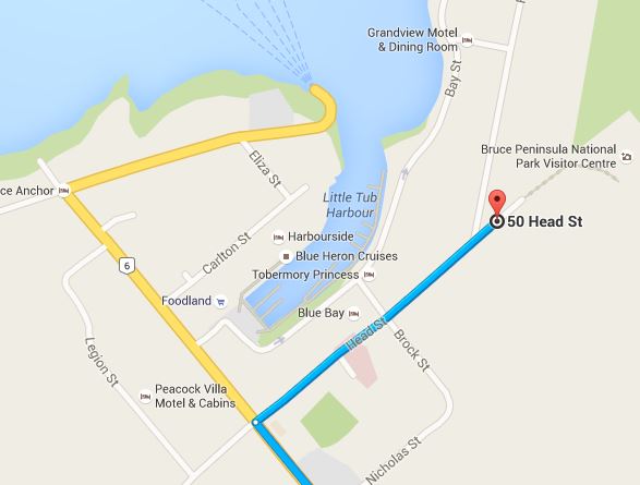 Two major Hwys to remember. Get on to Hwy 10 north to Owen Sound where it leads to Hwy 6, grab a Tims take a break, get on to Hwy 6 and stay on it until almost the end. Once you get to Tobermory as you pass the coummunity center (on your right) take a right on Head St, drive past the post office about 100 meters and you will arrive at Nooree on your right.