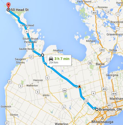 Two major Hwys to remember. Get on to Hwy 10 north to Owen Sound where it leads to Hwy 6, grab a Tims take a break, get on to Hwy 6 and stay on it until almost the end. Once you get to Tobermory as you pass the coummunity center (on your right) take a right on Head St, drive past the post office about 100 meters and you will arrive at Nooree on your right.